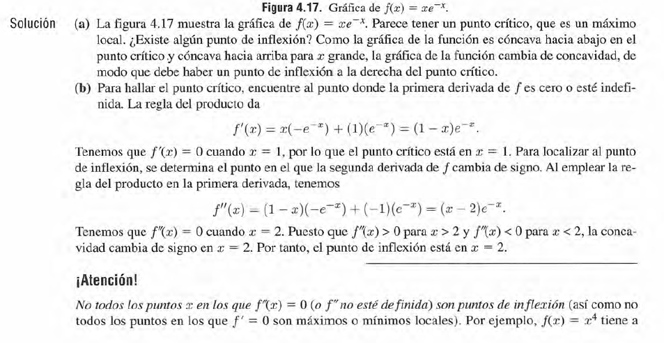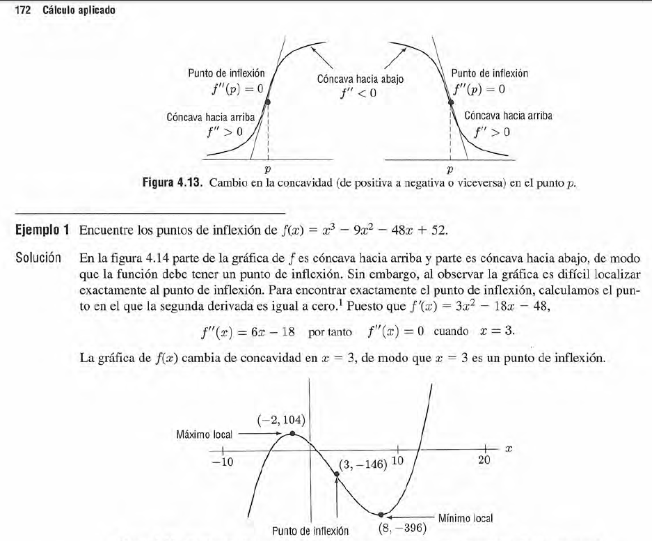Lean las siguientes páginas que introducen el concepto de punto de inflexión, extraídas del libro Cálculo Aplicado de Hallett. Intenten resolver los ejemplos antes de leer cada solución.