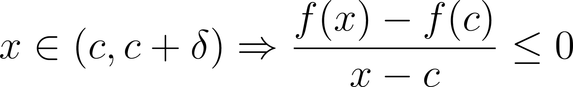 Supongamos que sea el punto del máximo (la demostración es análoga mutatis mutandis para el caso del mínimo). Tomando un suficientemente chico, en un intervalo , para todo se cumple: y que para todo . Entonces los límites laterales son uno mayor o igual a cero y el otro menor o igual a cero. Pero como por derivabilidad deben ser iguales entonces la derivada de tiene que ser a la vez mayor o igual y menor o igual que cero, con lo cual es cero.