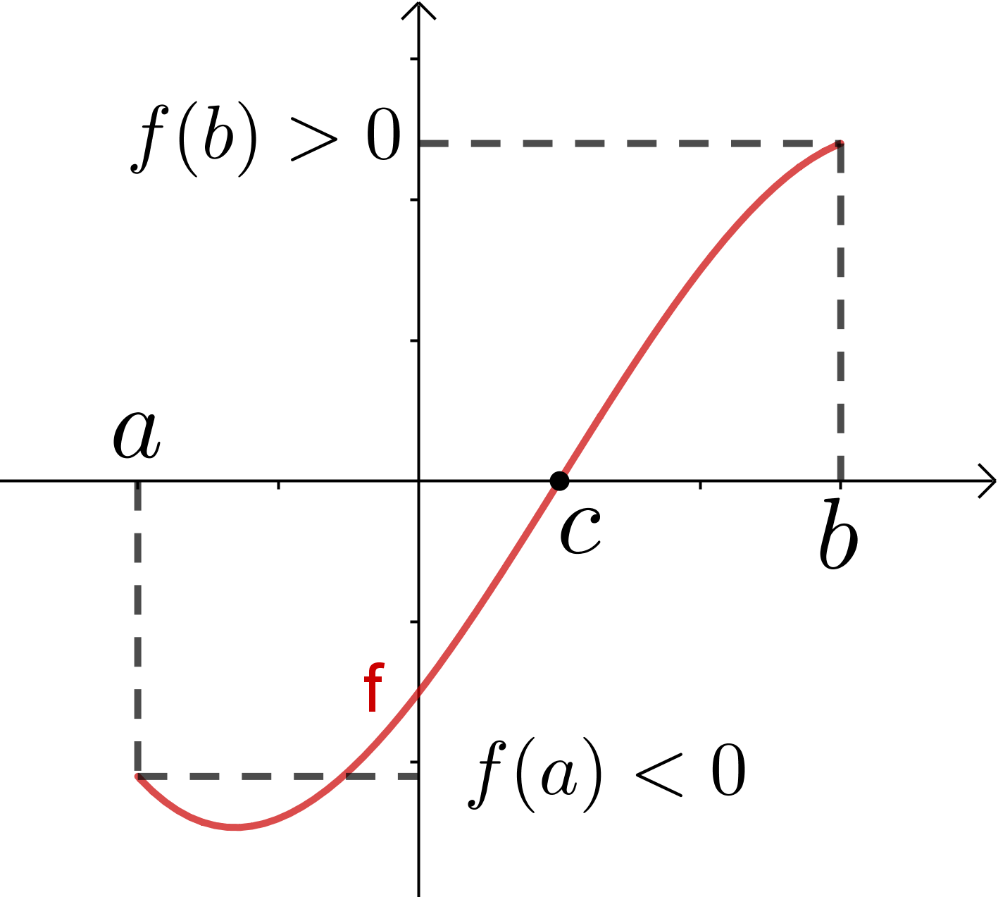 Bernard Bolzano [1781-1848, Checo/Alemán]: Sea una función continua en un intervalo cerrado con y de signos contrarios. Entonces existe al menos un punto del intervalo abierto con . | |