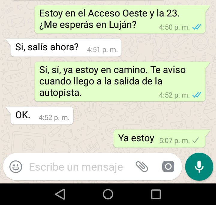 Un conductor fue detenido por la Policía, para un control, en la salida del Acceso Oeste, llegando a Luján. En su teléfono celular se podía observar la conversación que se reproduce acá abajo. Se sabe que en ese tramo de la autopista la velocidad máxima permitida es de . La Policía acusa al conductor de haber cometido un exceso de velocidad en algún momento de su recorrido. Propongan argumentos a favor del conductor y de la Policía. ¿Quién piensa que tiene razón? ¿Puede saberse?
