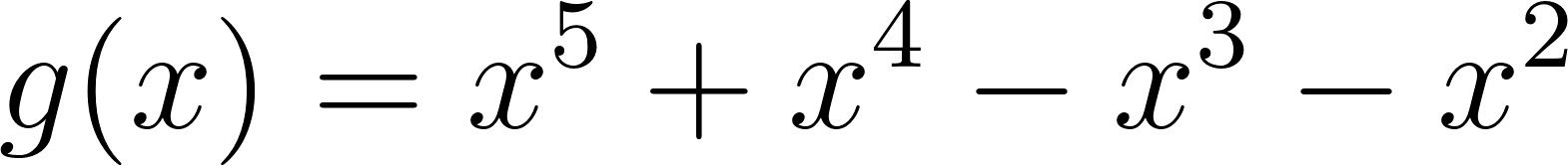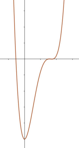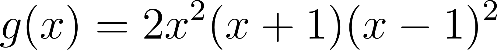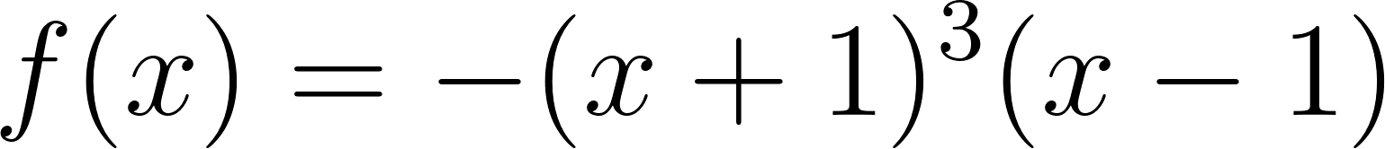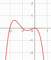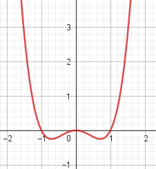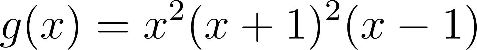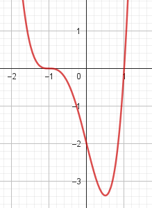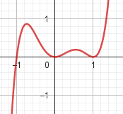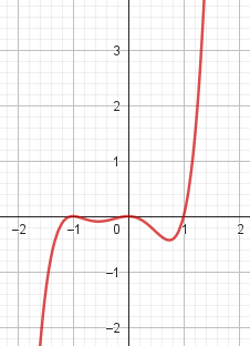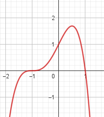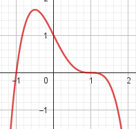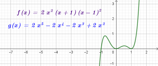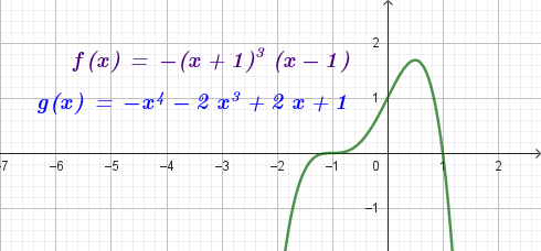 No, porque su coeficiente principal es negativo, tiene raíces -1 y 1 (multiplicidad=3): Desarrollada: | Este gráfico se corresponde con g(x) ya que su coeficiente principal es positivo, sus raíces son -1, 0 (multiplicidad = 2) y 1 (multiplicidad = 2): Desarrollada: |