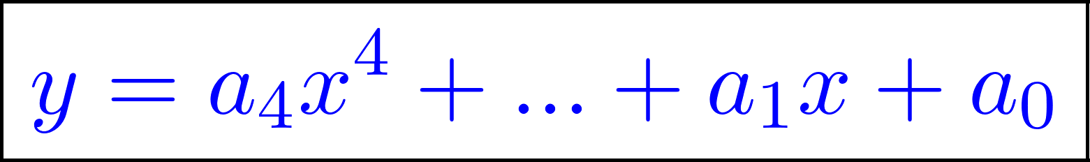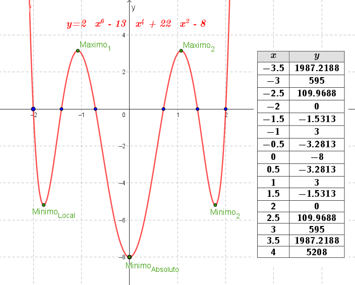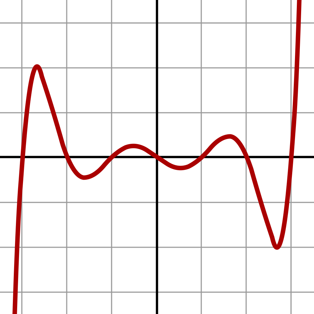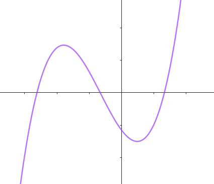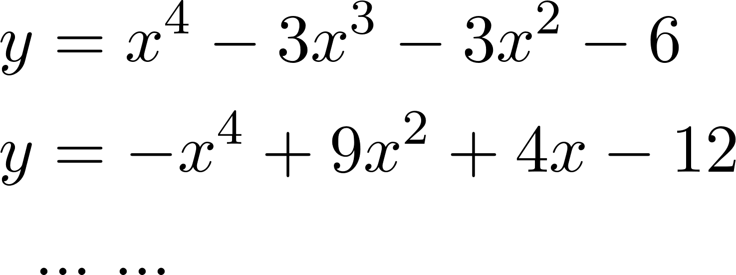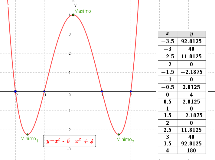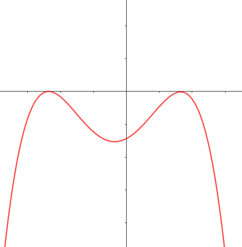 Funciones polinómicas de 4° grado | Su gráfica es una curva Tienen ramas parabólicas | A veces, y con 4 raíces reales, la curva toma las siguientes formas: Si a > 0 la curva tiene una forma parecida a una W mayúsculas. Si a < 0 tiene forma parecida a una M mayúsculas. Cuanto mayor es |a| más estilizada es la curva y viceversa. Los puntos de corte con el eje X: Se obtienen resolviendo la ecuación de 4° grado asociada, igualada a 0. El punto de corte con el eje Y: Se obtiene calculando , siendo . | ||