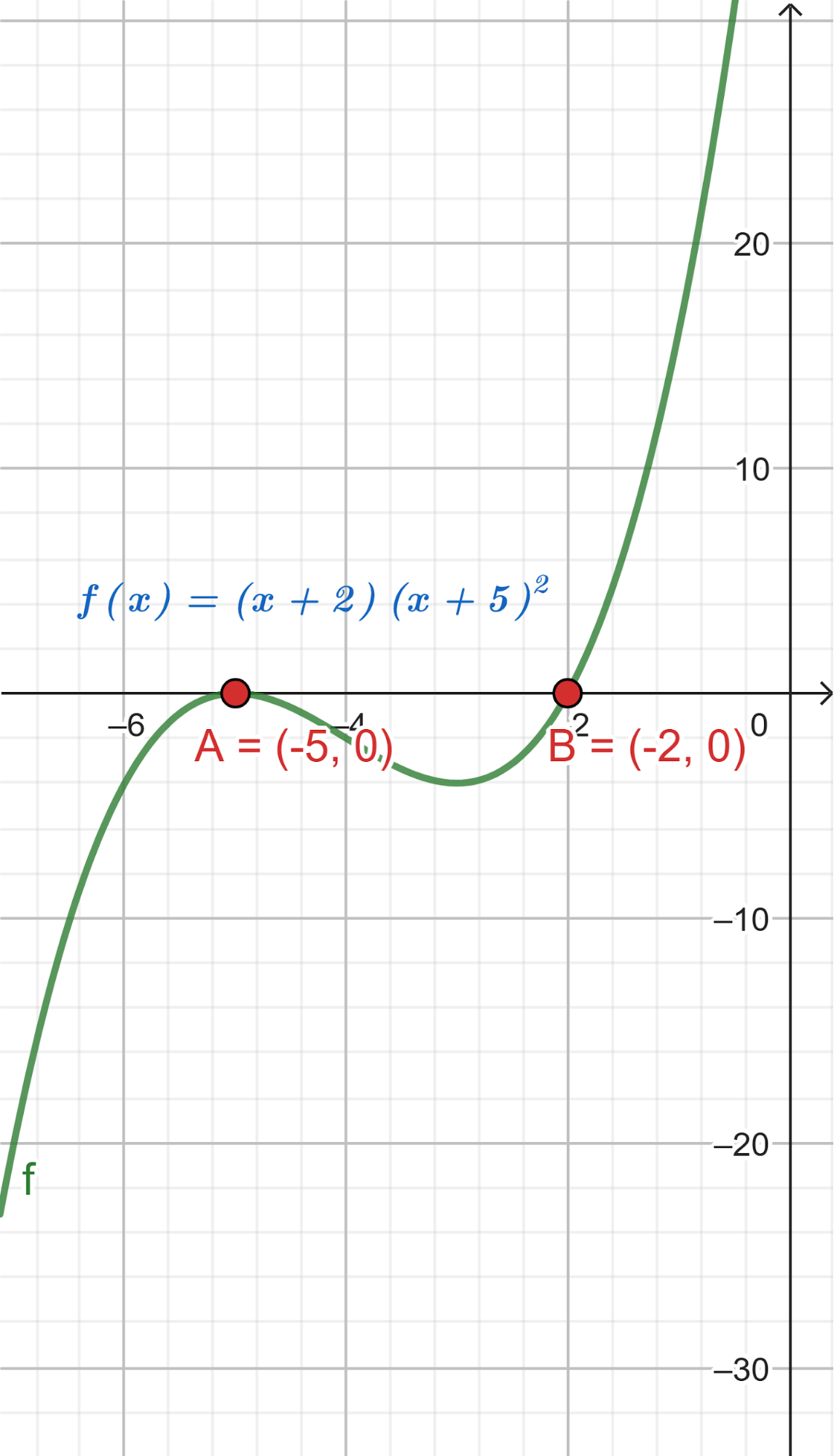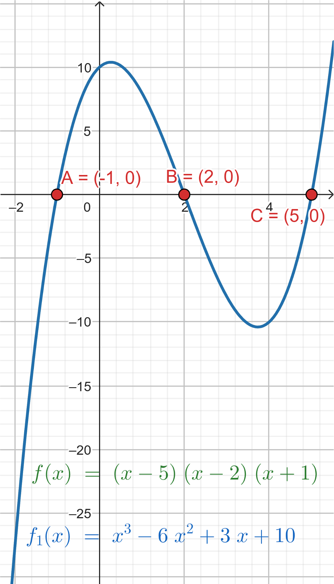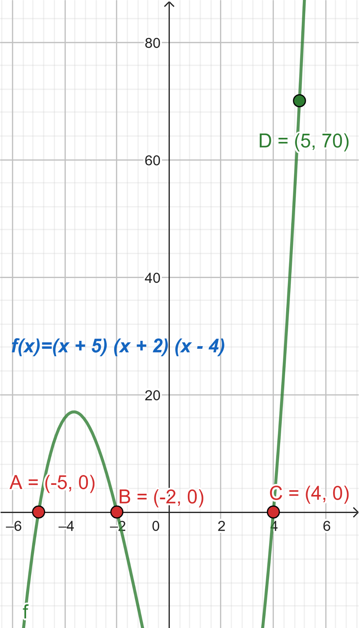 - Las raíces son -5, -2, 4 y toma valores negativos para mayores que 4.