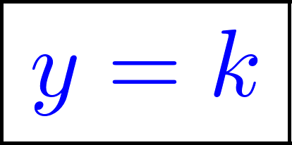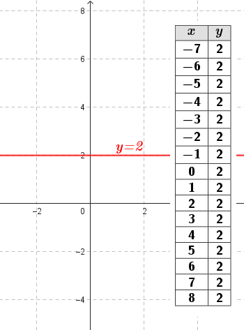 Función constante | Su gráfica es una recta | Su gráfica es una recta horizontal paralela al eje de abscisas (eje X). Si k > 0 entonces la recta está por encima del eje X. Si k < 0 entonces la recta está por debajo del eje X. NOTA: Las rectas verticales, paralelas al eje Y, tienen como expresión algebraica. | ||