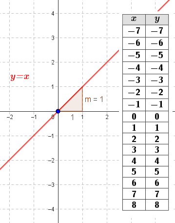 Funciones polinómicas de 1° grado Función identidad | Dada Si y entonces Su gráfica es una recta | Su pendiente es m = 1 Es la bisectriz del 1° y 3° cuadrante y forma un ángulo de 45° con el eje X. Siempre pasa por el origen de coordenadas O(0, 0). Es la bisectriz del 2° y 4° cuadrante. | ||