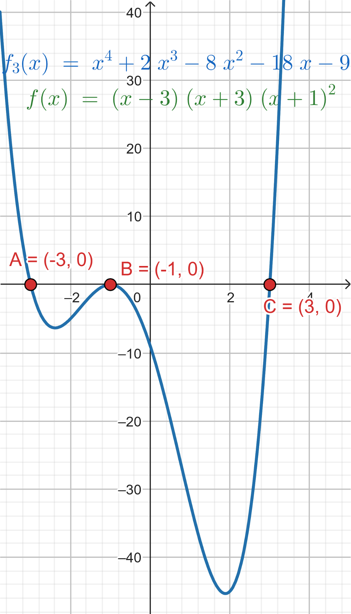 Desarrollamos el polinomio hasta llegar a la misma función a partir de la cual buscamos sus raíces mediante Ruffini obteniendo solucionando con la resolvente y verificando.