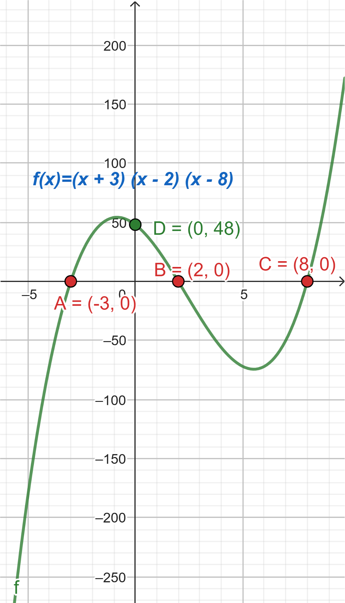 - Las raíces son -3, 2, 8 y el gráfico de corta al eje de las en 12.