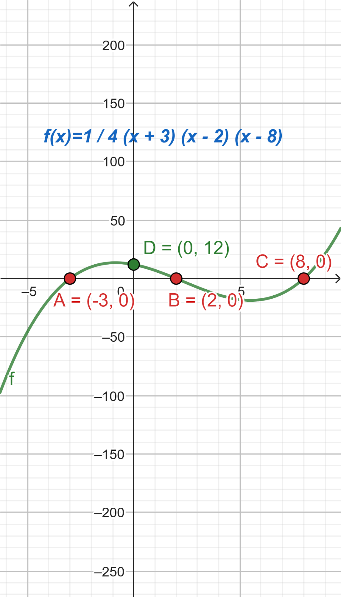 Cumpliendo que sus raíces sean -3, 2, 8 y el corte de ordenada 12.