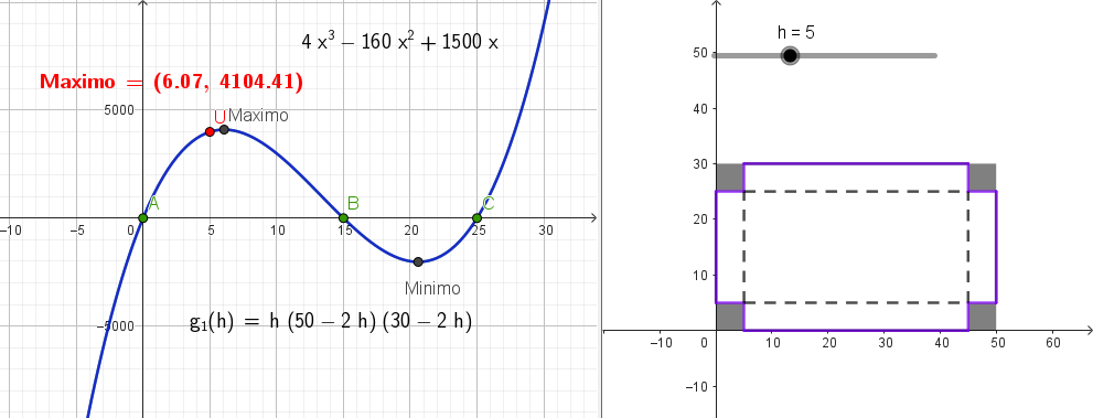 Al graficar en GeoGebra y utilizar la herramienta Extremos Relativos podemos observar que el máximo volumen se dá cuando con un volumen de
