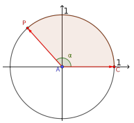 Consideramos un hecho aceptado que la longitud de una circunferencia es donde es el radio. Por lo tanto, la circunferencia trigonométrica tiene una longitud de . Un punto cualquiera de la circunferencia puede representarse con un vector que nace en el origen y termina en el punto. |