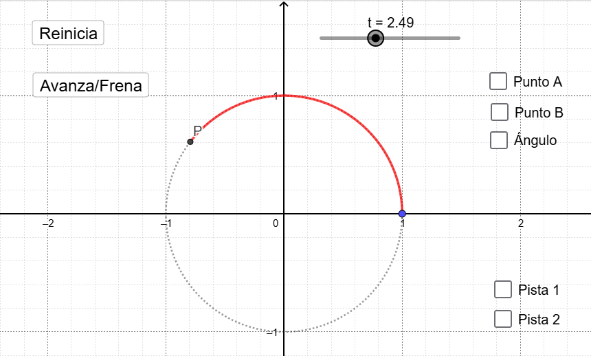 Se definen dos funciones e como las coordenadas e del punto en función de la distancia recorrida en su tránsito por la circunferencia, en el sentido contrario a las agujas del reloj. El applet tiene opciones que pueden activar o desactivar, para apreciar distintos detalles. Es tarea de ustedes interpretar para qué les pueden servir esos detalles